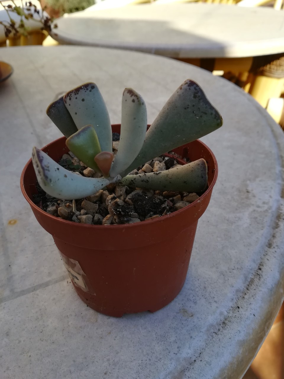 es como todas las que cambian según la estación, mañana cambiare de sitio a una jovencita que no enrojece como debe y creo quwe donde la puse todo el invierno es el trozo de la terraza que queda mas horas sin sol directo y probare a ver si es lop que le ayudara a sacar todo su colorido he cambiado el sustrato a unas macetas y a una no recuerdo su nombre y no se en que carpeta tengo su antigua foto y también la tengo en un verde claro y no se donde buscar es esta, nombre por favor fenestraria aurantiaca veremos si se decide a florecer lo hace en un amarillo intenso y florecio tanto que parece quedo esxauta por eso le he cambiado el sustrato a ver si se mueve esta foto es de cuando florece no ahora esta es de hace 2 temporadas como ya se ve casi mas flores que planta,