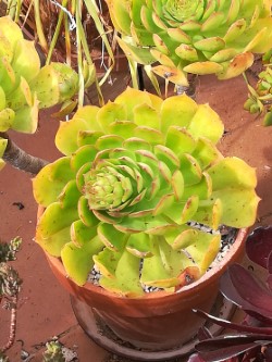 percarneun, primero era peque y se puso a tener plántulas muy grandes y hastantes de ella era a si de grande y hermoso y estuvo 8 años sin florecer y casi se murió por eso no entiendo que solo es tan poco tiempo se me vaya a desmoronar y no deseo perderlo, no son de estas plantas que si les cortas el apice que florece se paren por eso estoy desolada al verlo ______________________________________________________________________ como ya comentamos según el frio cambian de colores este aeonium sigue haciéndolo amarillean sus centros que da gusto verla aeonium kiwonium
