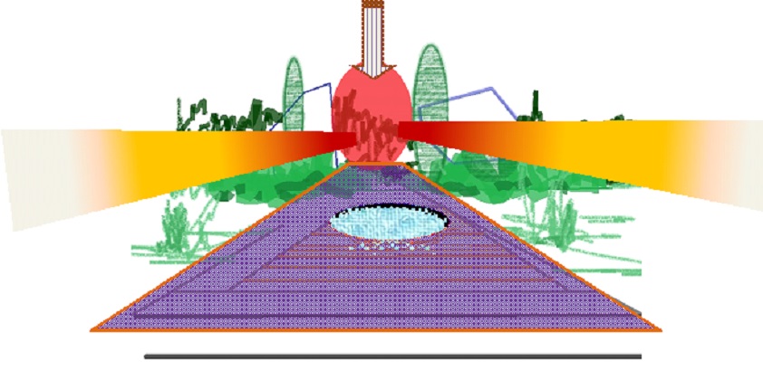 Gracias por las observaciones Les explico: el plano morado y los 2 amarillos laterales son solo grafica para hacer mas evidente la perspectiva hacia ese espacio vacio que es el realmente importante y que grafique en rojo, eso nada mas. Se que el suelo es mas bajo y por eso luego envie un dibujo mas simple mostrando solo ese espacio al fondo. Y esa pespectiva la cree imaginando como se ve ANTES DE ACCEDER a esa terraza (o sea que antes de bajar por los peladaños). porque es esa la vista que se tendra de esa sección de ese nivel del jardín. es el programa mas Universal del mundo: el famosisimo y a veces no muy comprendido Paint! . Llevado a una nuevadimensión por este servidorrr.