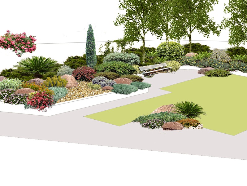.... se me ocurre que los parterres podrían estar levantados con un murete de unos 50 / 60 cm. + ó -........................ por supuesto que las plantas, arbustos y árboles pueden variar, así como la densidad..........