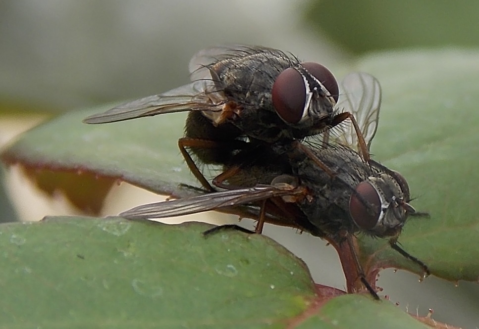 Pako, la cópula es de Muscina stabulans La 59 es un macho de Muscina sp. Lamentablemente no se le ven ni las patas ni las antenas así que no puedo saber qué especie es El resto de caractereres no son definitivos sin los principales Hay 4 especies de Muscina en España, 3 de ellas de comunes a muy comunes y conviven en las mismas zonas 2 y 3 especies sin problema. No te puedo garantizar que sea la misma especie que la cópula La 60 es una hembrita de Musca domestica, la 61, efectivamenteb, es Calliphora vicina (un macho) y la 62 una hembra de Muscina sp. (de nuevo no veo lo suficiente para poder saber la especie )