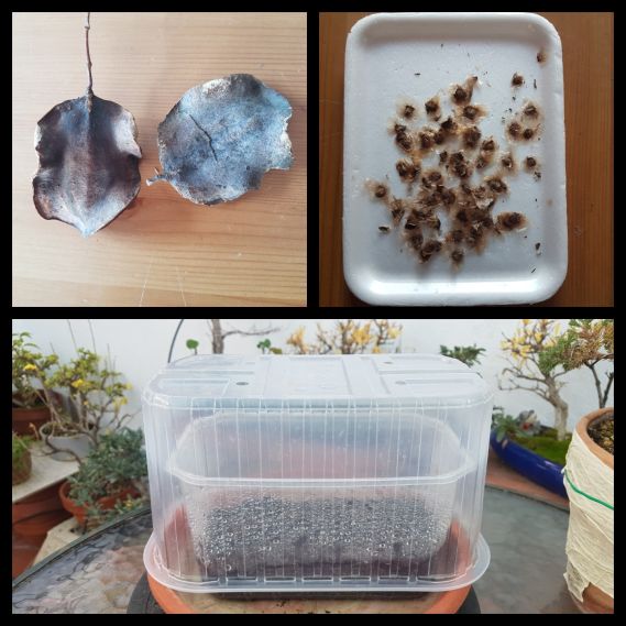 Semillas de jacarandá que he sembrado hoy. Los frutos estaban recién caídos y empezando a abrir por lo que las semillas deben estar en su punto. El invernaderito es low cost hecho con cestas de la fruta.