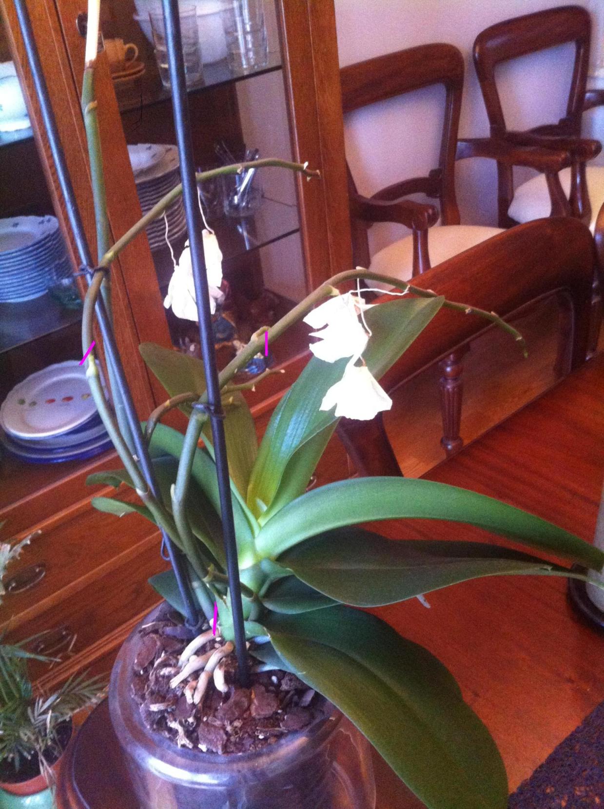 Hola. Tras muchos meses en flor (y no sé si influido por el aceite...), se han caído de golpe, las trece flores de mi phal más grande. Me sorprende porque se abrieron "escalonadas", pero se han marchitado, 1 hace más de 1 mes, y las otras 13 en una semana. Como dije, dio 14 flores en 2 varas y una subvara. Me encuentro con el mismo problema que en la otra phal, que fue objeto del presente hilo... ¿Corto o no corto? Ya me habéis aconsejado lo suficiente, en uno y otro sentido, así que os cuento lo que voy a hacer, ¡salvo que lo consideréis una barbaridad¡ - La vara antigua, que ya dio una subvara, y que apenas si le quedan nudos, la cortaré en su inserción a la corona. Aunque tiene como una segunda subvara de unos 5 cm "paralizada" desde que floreció la otra. - Las 2 varas que dio hace como 4 meses, las cortaré a distintas alturas, por encima de un nudo en los que ya presenta, desde que floreció, sendas subvaras de unos 2 cm, que supongo que se desarrollarán. Me sabe mal cortar esas varas tan gruesas totalmente. En un caso quedan dejaré 3 ó 4 nudos, y en otro 2 ó 3. Ya he empezado a abonarla, después de todo el verano sin hacerlo, ya que me dijísteis que no conviene en floración. Os pongo una foto en la que marco los cortes con color fucsia, y os agradezco todos los comentarios que consideréis oportuno. Gracias.