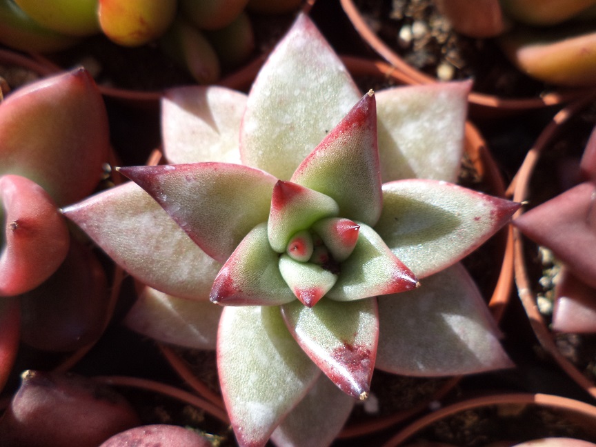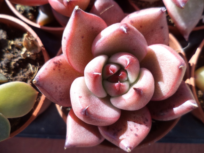 Yolanda, esa 'Compton Carousel' se sale de bonita... Echeveria nodulosa 'Painted Beauty' (Las manchitas blancas son restos del fungicida)
