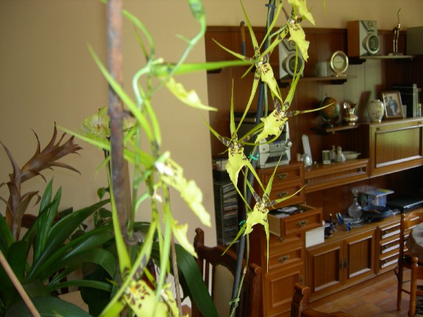 Después de mas de un mes, desde que aparecieron sus pequeñitas varas florales, esperando que la floración llegara a buen puerto, por fin se ha decidido. Es una planta bastante grande que ha tardado dos años desde la última vez que floreció, pero creo que la espera ha valido la pena. Os pongo unas fotos, malas como siempre, pero es que con la ilusión que me ha hecho no puedo esperar a sacar otras. El próximo fin de semana me ayudarán para poner fotos en mejores condiciones. BRASSIDIUM SHOOTING STAR X BRASSIA LONGISSIMA Saludosssss