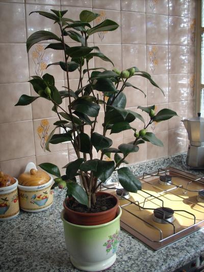Chic@s : ésto se está convirtiendo en puro vicio Esta mañana he tenido que salir fuera de mi barrio y ... ¡he encontrado un vivero! en realidad es una floristería que se llama Viveros Ordesa, pero, la verdad es que tenían un montón de plantas y, claro, algo me tenía que traer ¿no? Camelia Japónica, el señor, que daba toda clase de explicaciones, me ha dicho que puede soportar en exterior en invierno... además está cargadita de capullos Asi que, por favor ¡necesito toda la información de los que la tengais para cuidarla y que me dure! Y esta foto es por si Frankky se pasa por aquí. Para que vea que no le miento respecto a mis Crocus : Estoy por ponerla como "planta colgante"