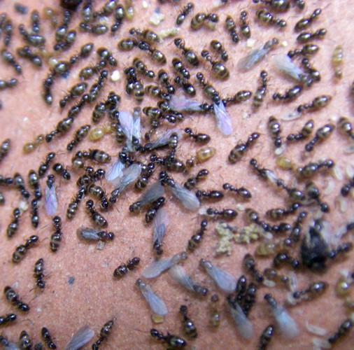 Las hormigas (ya sean de casta sexuada (="voladoras") o estériles (="no voladoras")) se agrupan junto con las carcomas, demás escarabajos, mariposas, avispas, abejas, moscas y mosquitos en la misma división de insectos, mientras que las cucarachas, saltamontes, libélulas, chinches, etc se agrupan en la otra mitad de insectos. Ahí termina todo el parecido y el parentesco. Siguen sin parecerse en nada. Tal vez vuelvas a confundir las termitas con carcomas, dado que las termitas, aunque no tengan el más mínimo parentesco, tienen una organización social similar a la de las hormigas (a veces se las llama"hormigas blancas", y también tienen castas sin alas y castas reproductivas aladas. Para cucarachas se usan diferentes insecticidas que para carcomas. Para carcomas se pueden usar los mismos insecticidas que para termitas en muchos casos. No tiene absolutamente ningún sentido el hablar de insectidas en este tema. Si un usuario pusiera una foto de un colibrí (picaflor, zunzún o como lo quieras llamar) asesinado, ¿tendría sentido ponerse hablar de la mejor manera de exterminar colibríes???????????? Y ahora unas pequeñas clases para intentar darte una base mínima de conocimientos antes de responder tan desacertadamente: Esto es un ejemplo de ccuaracha. Las cucarachas son un Suborden del Orden Dictyoptera, orden que posee además de ése otros dos Subórdenes: el suborden Isoptera (termitas) y el suborden Mantodea (mantis religiosas). Cada Suborden está formado por numerosas Familias. Así pues, unas cucarachas son de diferente familia que otras cucarachas, unas termitas son de diferente familia que otras termitas, y unas mantis son de diferente familia que otras mantis. Eso imposibilita que una cucaracha pueda ser de la misma familia que ningún tipo de termita, y muchísimo menos, que una carcoma. Las cucarachas son un suborden enormemente rico y diverso con aproximadamente 4500 especies repartidas en unos 500 géneros. De las 4500, tan sólo 20 (menos del 0'5%!!!!) pueden llegar a causar ocasionales molestias al ser humano al vivir dentro de las casas, y sólo 4 de esas 20 (pertenecientes a 2 familias) pueden llegar a constituir verdaderas plagas domésticas globalmente. De esas 4, tan sólo 1 (la cucaracha alemana, Blattella germanica, de la familia Blattellidae) puede causar problemas graves, transmitiendo enfermedades y contaminando alimentos. Ninguna de las especies "domésticas" de cucarachas tiene interés en la madera, y no se tratan con los mismos insecticidas que los insectos que atacan la madera. La estigmatización absolutamente injusta e increiblemente absurda de las cucarachas como "plaga molesta" sería equivalente al de odiar a muerte a todos los mamíferos y tratar de exterminarlos a todos, tan sólo porque la rata gris puede ser una plaga. Evidentemente, la cucaracha asesinada de este tema, es una cucaracha normal, exobia, que entró en la casa por pura casualidad y allí halló la muerte y que era totalmente incapaz de causar molestia alguna. Esto son termitas. También llamadas comejenes. En promedio, son muchísimo más pequeñas que las cucarachas y tienen una apariencia absolutamente diferente, pero están emparentadas. Las termitas son el segundo suborden del orden Dictyoptera, junto con los otros dos subórdenes (cucarachas y mantis). Todas las termitas se alimentan de materia vegetal muerta, y la mayor parte lo hacen de madera. También es un suborden muy diversificado: cuenta con unas 3000 especies, repartidas en numerosos géneros y familias. De esas tres mil, tan sólo seis (un 0,2% de las especies!!!!) son plagas urbanas que afectan a la madera de las construcciones humanas. A diferencia de las cucarachas, que son un grupo de aspecto algo más heterogéneo, las termitas son de aspecto bastante similar unas a otras. La casta obrera de todas las especies está formada por insectos pequeños y pálidos, de tejido blando, que nunca salen al exterior. La casta de los soldados tienen cuerpos parecidos a los de las obreras, blandos y pálidos, pero sus cabezas son muy agrandadas y duras, y provistas de fuertes mandíbulas para la defensad e su nido, o de armas químicas en su lugar. Los individuos sexuados son totalmente diferentes, de tegumento coriáceo y oscuro, y antes de copular tienen cuatro enormes alas alargadas de aspecto delicado. Al copular pierden las alas y se convierten en rey y reina, el rey se queda con el mismo aspecto solo que sin alas, y la reina hincha su abdomen enormemente para albergar los huevos. En la foto de arriba se pueden ver obreras y sexuados (alados), y también un soldado. Aquellas especies de termitas que constituyen plagas de la madera de construcciones humanas, pueden ocasionar graves daños y destruir por completo la estructura de madera de un edificio. No atacan la madera que haya sido previamente tratada con insecticidas específicos para plagas de madera. Para atacar la madera, estas especies de termitas viven dentro de ella y la van devorando causando galerías comunitarias en su interior, donde todoso los individuos de la colonia viven juntos. Esto son hormigas. Como en el caso de las termitas, he elegido de entre mis fotos una que mostrase a la vez castas no reproductivas (obreras) y castas reproductivas o "voladoras" de la misma especie. Esto es una muestra de que las hormigas en su mayor parte tienen una organización social muy similar a la de las termitas, un sistema llamado "eusocial" que sólo comparten las termitas, las hormigas, unas pocas especies de abejas y avispas, y las ratas topo desnudas. Es un ejemplo de convergencia evolutiva: animales muy diferentes unos de otros que desarrollan una característica similar por adaptarse al mismo modo de vida. Igual que nunca confundiríamos una rata topo con una hormiga, tampoco tiene sentido confundir una termita con una hormiga. Aunque tengan el mismo sistema social, su aspecto es absolutamente diferente. Las hormigas son una sola familia, la familia Formicida
