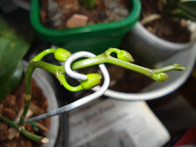 Sera que a esta tampoco le gusta estar afuera? Si estando adentro te florece... quizas la tenga que entrar! Segui pasando el informe Respecto de las Phal... no pulverizas los botones florales, no? Si la estas fertilizando, no lo hagas. No se me ocurre otra cosa, a ver si a los demas si Mirtha subiste a la terraza?? Como estan tus orquis? Se recuperaron? Novedad: despues de dos años de espera, mi Protrechea Cochleata se decidio a largar varitas