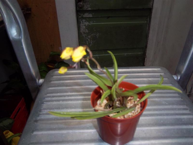 Quelita, muy linda, cuando abra subí otra foto para verla en su esplendor. Con respecto al cambio, te conviene hacerlo en primavera. Tené sumo cuidado de no mojarle las hojas, pues hoja húmeda es hoja que cae. Te hago una pregunta: fijate bien si las hojas no salen como de un pequeñito pseudobulbo menor de un centímetro. Pienso que podría ser un Oncidium Midas. Saludos