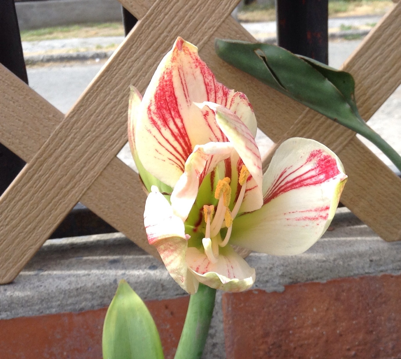 Disculpa pero como dije antes la foto apesta trataré de tomarle otra mañana, la flor es blanca y tiene unas líneas rojas