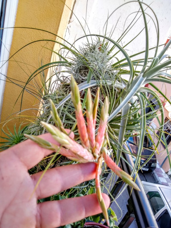Hola!! Cuánto vicio hay en este foro. Con tantas novedades que tenéis todos es imposible llegar a fin de año sin realizar más compras. Esa mini duratii híbrida, por ejemplo, es tentadora... Hoy traigo fotos de tres de mis tillis. La primera es la mauryana, que creo que va a morir sin descendencia . No sé si recordáis que os dije que algo estaba dañando al hijuelo y que tuve que quitarlo... no era un caracol ni babosa porque no hay baba suya, sino una melaza que no sé si excreta la propia planta o algún insecto. Había insectos pequeñísimos alrededor pero no sé si ellos lo provocaron o si solo se sintieron atraídos por esa sustancia. Por si acaso apliqué un insecticida sistémico pero sea lo que sea sigue avanzando... Esto es tras quitarle el hijuelo, se destapó "eso" marrón... Esta es de ahora. Le quité la inflorescencia para limpiarlo bien pero esa melaza o lo que sea sigue saliendo. Se ve fatal, pero la flecha azul señala la que es fresca, casi transparente y con una consistencia de caramelo derretido, y la flecha roja es lo mismo pero ya cristalizado, que se vuelve de color café. Es como la resina de algunos árboles, pero no sé si una tillandsia puede soltarla en esas cantidades. ¿Se os ocurre algo para detenerlo? Por otra parte, la xero sigue floreciendo. La vara llamativa y las flores discretas combinan muy bien. En la foto, una flor abierta ayer con una de hace 15 días La vez anterior os dije que ya no esperaba más floraciones y resulta que la araujei que os presenté el mes pasado me ha dado un zasca en toda la boca. Hale, por hablar. Se pasó 2 años creciendo lentamente, se quemó, empezó a crecer a muy buen ritmo y ahora... Lo dicho, si tenéis alguna idea para la mauryana soy toda oídos. He mirado por webs, foros, facebook... y no encuentro nada similar con tillandsias. Creo que voy a perderla...