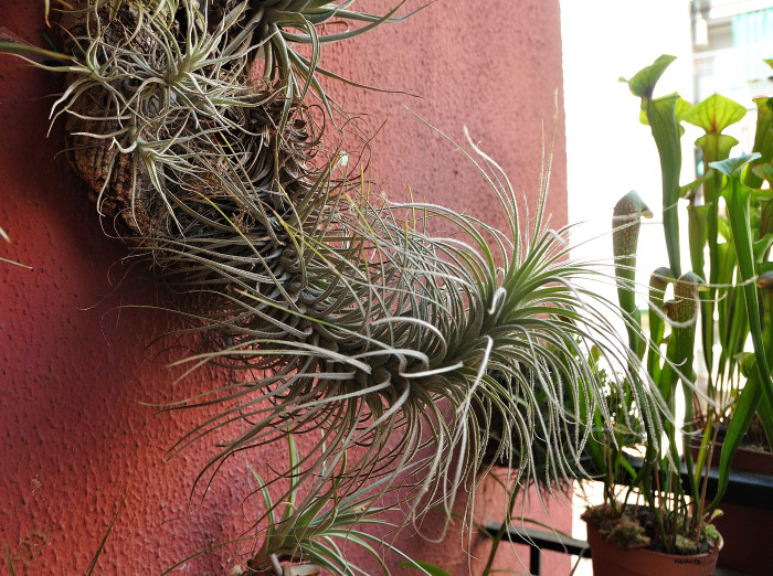 @Floreta qué tamaño tiene tu balbisiana?, la mía es jovencita se la compré a Pablo estas navidades, hace la parte del bulbo 10cm y las hojas más largas unos 30cm. Parece que esta especie para que florezca en pleno verano cuando más calor hace hay que suspender los riegos, se deshidrata mogollón y después retomar el riego normal, si hay suerte florece. Yo no lo voy a hacer con la mía, prefiero una planta grande y hermosa y entonces podrá hacer una floración en condiciones en el futuro, no sé, eso ya es decisión tuya si lo quieres probar o no. Si compras etileno en forma liquido conseguirías tener floraciones en plantas muy jóvenes, pero después vendrían los problemas serían floraciones mediocres y a lo mejor correría peligro la vida de la joven planta. Unas fotos de mi tectorum gigantea. Está en una pared con bastante sol. Esa estructura de corcho hace 80cm de largo. La planta sigue igual, solo que tuve un problema con ella, alguien le dio un golpe al pasar y se me desprendió de su soporte. Aproveché para cortar la parte vieja, es que pasaría ya del medio metro con tranquilidad de largo y no dispongo de más espacio. Sigue igual nunca se ha fijado ni ha hecho ningún hijuelo. De ancho mide 30cm aprox. Me encanta esta tillandsia. Esta primavera me dio un susto, se empezó a poner rojiza la parte de en medio, pero después volvió a su color normal. Por si alguien tiene curiosidad de arriba a abajo, T. didistichia, latifolia, fresnelloides, fasciculata, diaguitensis, pohliana, otra latifolia, chusgonensis, tectorum y mauryana. Foto de casi la pared entera. He marcado una tectorum de tamaño normal. Esta es la parte que al envejecer va formando tronco. De perfil. Pues eso yo hace ocho años que la tengo y ya era grande cuando la compré, haría unos 15cm de largo, a saber los años que tiene esa planta. Un poquito más a la derecha de la tectorum ya está el territorio de las sarracenias, es la zona que tengo más sol. Para idea de tamaños, las sarras más altas las hojas hacen casi 55cm.