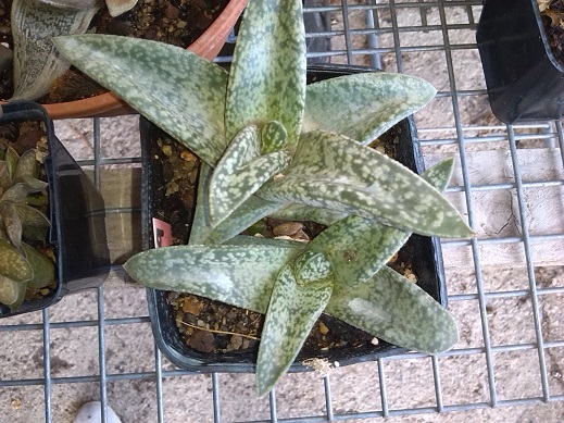 No creo May haber movido la etiqueta. Es el 19 de la venta que hizo Robin este verano. Cuando hize el pedido no guardé el nombre ya que siempre lo pone. Ponen numeros cada vez que ponen plantas para vender, pero luego cuando te las mandan, sacan las etiquetas con los umeros y te las mandan con los nombres. Lo que si se, es que es un cruze, supongo Gasteraloe !