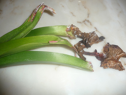 Llevo muchos años teniendo hippeastrum, hoy estaba regando y dado cuenta que uno de ellos en las uniones de las hojas están secas y se caen, y en las hojas más jóvenes están blancas, que es y qué puedo hacer.