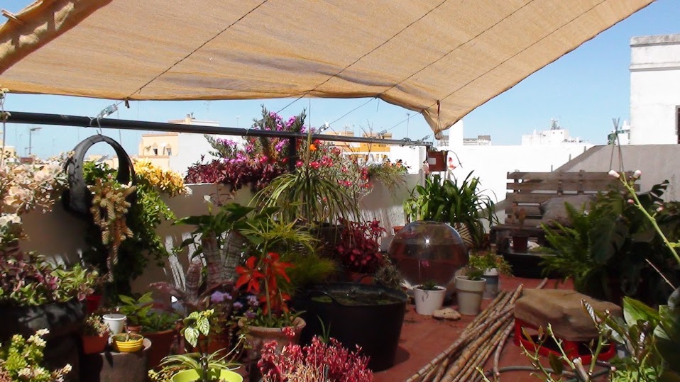 Re: LAS COSAS DE ROSA IX Perdon ame y osva por repetirme pero aqui tambien queria traer la terracita pa mostrar como va..aunque solo se ve un trocin pero bueno voy a compartir una parte de la terraza aunqeu está un poco desastre pero bueno... el sombreo está levantao por ahi para poder ver las messem y lampranthus o como se llamen. Las cañas hoy las he colocado a la tarde al fondo, detras del banquito de palets, para que trepen las ipomeas y otras trepadoras.. solo que no lo puse como osva, sino entrecruzadas de manera irregular.. pero me faltan cañas.. aun tambien tengo que poner orden y limpiar el suelo bien(bueno eso es un constante ) poner de nuevo las mariposas de cámara que cayeron en el sombreo.. pero aun así esta muucho mejor que estabaaa.. La bola como veis sigue vacia.. y mientras saque a naranjito porque me daba pena que estuviese ahi mientras manipulo para poner plantas del acuario.. eso me gustaria hacerlo mañana pero tengo que ir a por grava.. pero a que queda mona la bola ahi enmedio?? jajaj por cierto hoy hacia un calor infernal y el agua de la bola estaba fresca y bueno esa es mi parte del sombreo que es la que esta un poquito mas decente