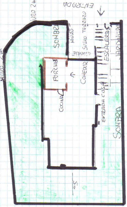 Re: MI GRAN ILUSION ´´TENER UN JARDIN´´ Mando el plano para ver la salida de la cocina ycomedor al porche, y la parte frontal de la puerta de la cocina,es donde da la sombra todo el dia. La vivienda está en alto, abajo está el garaje.