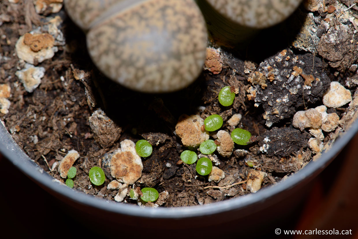 Un impas - anécdota en este tiempo de la floración. 21-09-2018. Las lluvias de estos días han traído esta sorpresa; algunas semillas, que en su día cayeron de los cogollos abiertos al sustrato (esta pasada primavera) han germinado esta semana. Estos son "hijitos" del L. karasmontana que se ve en la imagen. En la base del Llithops podéis apreciarlos en un tono verde fosforito. No prosperaran, porque necesitan humedad continuada y esto no es viable para el mantenimiento de los Lithops adultos. Pero es curioso ver como sin ningún tipo de cuidados (y me quiero acordar ahora de los mimos hacia nuestros semilleros), estas plántulas están vivitas y coleando. En fin, una anécdota mas que deparan estas fantásticas plantas.