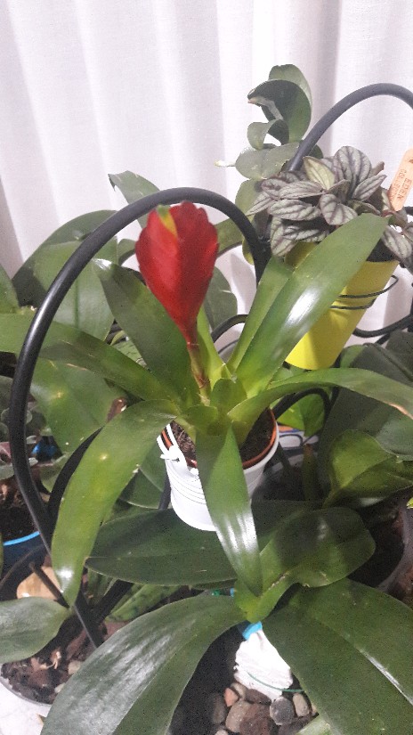 Os pongo foto de la bromelia con la flor que está saliendo. Y la espatas de la catt , que si, caprichosa va a dar flores.