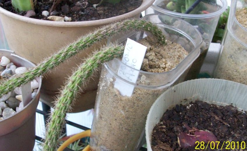 mira yo al principio tambien tenia problemas asta que se me ocurrio ponerlos en arena y asta ahora me van todos, eso si tienes que controlar mucho los riegos veras yo los pongo en vasos o cacharritos transparentes un poco altos para asi poder ver si van sacarndo raicillas y como van de agua, lo que hago es ponerles en el fondo piedrillas de drenaje pero sin hacerles los agujeros (eso si entonces tienes que vigilar mucho los riegos o la ausencia de ellos y despues de esa capita de piedrillas le echo arena, solo arena (yo le echo de la de construccion)y "pincho "el esquejito en la maceta, dejo esperar un tiempito (una semana o asi, dependera del tiempo que haga y de la estacion en la que lo haga)y despues riego un poquito (lo tanto de un culin o menos), solo que la parte de arriba del sustrato se moje, que no se encharque y despues lo dejo otro ratito sin regar y voy alternado bueno si tienes alguna duda solo tienes que preguntar mira no se ve muy bien pero asi sigue mi aporo cristata, la foto es vieja pero te sirve para hacerte una idea mira aqui te pongo otros que tengo asi, ahora estan mas gorditos, sin raices aun pero mucho mejor y el principal causante que me hizo probar la primera es de ahora, esta tal que asi (con raices y un bracito nuevo ) y la otra de meses antes (puedes ver en la etiqueta amarilla que fue puesta a enraizar en octubre del 2009)
