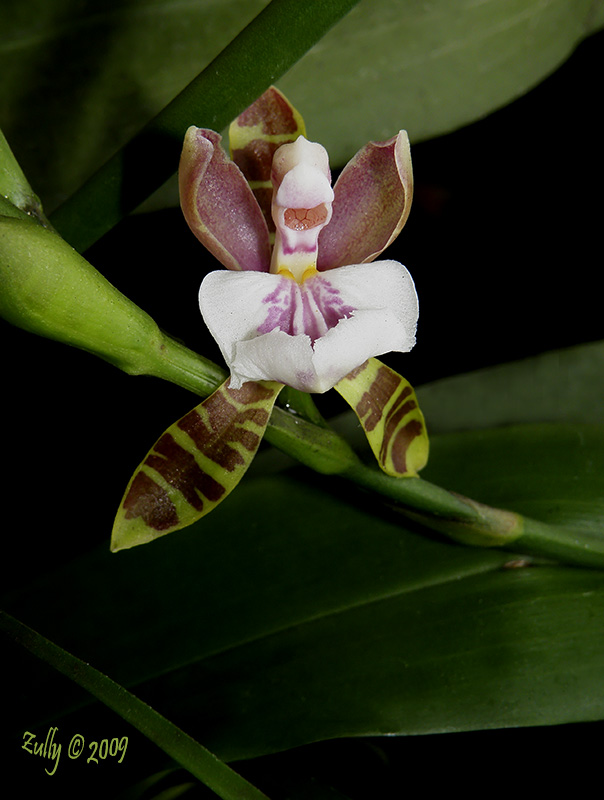La primera flor y la primera floración en mi balcón de esta nativa panameña. Está montada en madera y colocada a la sombra. Mormolyca ringens