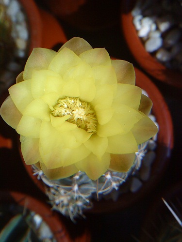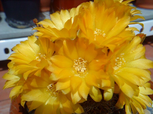 Hola Miranda, claro que estoy contento ,como no estarlo unas tomas mas Gymnocalyciun Andreae, la primera foto es hijo del ejemplar de la segunda foto, nunca habian coincidido florear al unisono y tengo otro que recien muestra el amarillo en el capullo, contento ?? nunca he conseguido semillas de ellos, ya les he pasado el pincel . . Gymno Hossei . . Gymno Erinaceum, dos ejemplares y el otro creo que Baldianum . . tomas mas generales de alguno de mis chiquitos . . saludos ch2