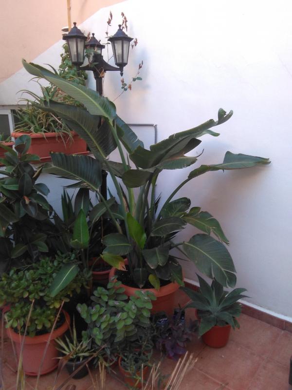 Cuanto tiempo sin dar señales de vida!!! Esque en el patio he metido poca mano, bueno, ninguna, para que nos vamos a engañar Pero la naturaleza sigue su curso, y las plantas siguen creciendo La strelitzia ya está mas alta que yo y sigue como loca echando ojas nuevas, ya lleva 3 hojas nuevas de cada pie, y a ver si alguien sabría decirme qué es esto que le está saliendo , será un hijo? Como ha llovido está todo mas verde El bambu todavía no ha brotado, pero mientras no salía planté jengibre y asi va Los cactus también han crecido Y en el patio de abajo todo sigue verde, menos las parras que se les cayó la hoja por abajo hace un mes y ya la irán perdiendo poco a poco también por arriba, las demás siguen muy verdes La costilla de adan se ha adaptado bien, a echado 2 o 3 hojas cada guía Y así vamos, ahora también he colonizado de plantas el balcón, con plantas adaptadas a las duras condiciones de un balcón acristalado orientado al sur Por si quereis echarle un ojo http://foro.infojardin.com/threads/un-balcon-lithopsero.93826/ Espero que os guste!!!!