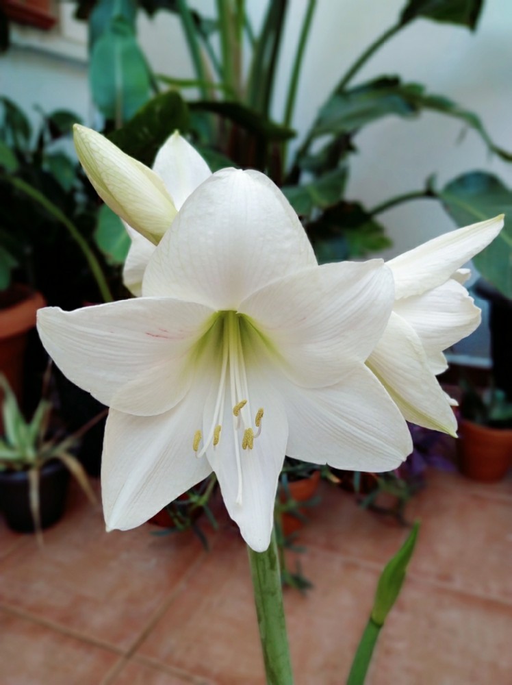Hola @Stapelia !! Jijijiji si que tengo espacio libre todavía...queda algo De novedades pocas, le he vuelto a decir a mi cuñado que tiene que tomarme medidas para la pergola...ya con vistas a la primavera...una vez esté instalada ya veré cómo sigo el proyecto de las tapas de madera de los maceteros, porque como ahora tengo muchas más minimacetas de cactus que el verano pasado quizás sería interesante hacer una estantería... Y poco más...la strelitzia ha abierto otra hoja, espero que no hiele...por aquí es raro... Y otra adquisición, una amarilys blanca, no era muy amante de los bulbos pero creo que a partir de ahora caerá alguno mas jijii Tiene una vara con 4 flores de un palmo de grandes, y otra vara creciendole...y después se quedan con las hojas verdes que también me gusta...mi madre tiene amarilys más de 30 años....dice que yo no había nacido cuando las plantó, osea que son longevas y muy duras, ella ni las ha cambiado de tierra ni nada, están aloquecaiga y solo le añade tierra si ve que la gata se las escarba Y eso es todo por ahora...iré poniendo avances poco a poco. FELIZ AÑO 2019!!!!!