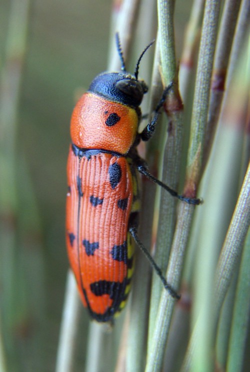 Bueno, quizás el resto salga... Acmaeodera pulchra. Especies parecidas: Buprestis octoguttata y Ptosima flavoguttata, ambos son mayores y tienen las manchas más anaranjadas o amarillas, nunca rojas. Buprestis sanguinea, es bastante variable, puede no tener ninguna mancha negra. Solo la hembra es roja, el macho es negro con manchas blancas. Vive sobre Ephedra