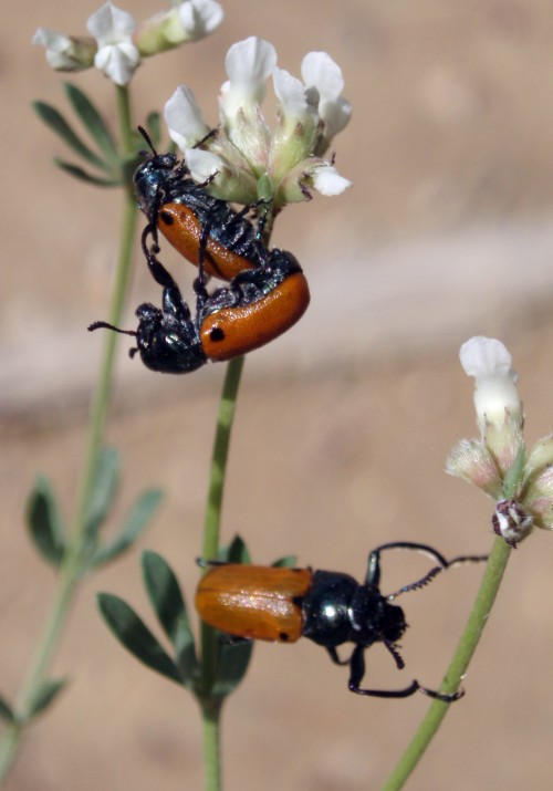 Cachis, se me ha perdido una parte con los intentos... Bueno, si sale esta parte bien, si no ya lo dejo Clytra athraphaxidis Clytra laeviuscula Clytra quadripunctata, los puntos posteriores son más pequeños que en laeviuscula (en C. espanoli son más grandes) Coptocephala scopolina, bueno es un género con especies imposibles de distinguir, muy comunes, primaverales Crioceris duodecimpunctata, sobre esparragueras Cryptocephalus bipunctatus, bastante variable Cryptocephalus infirmior, pronoto rojo Cryptocephalus lividimanus, con los bordes del pronoto claros Cryptocephalus loreyi, especie grande y rara Cryptocephalus obliteatifer Cryptocephalus octoguttatus, bastante común Cryptocephalus pominorum, muy distintivo Cryptocephalus quadripunctatus, la extensión de negro es variable Cryptocephalus rugicollis, inconfundible y sin duda el más común, con gran diferencia, de todos los Cryptocephalus Cryptocephalus tristigma Entomoscelis adonidis, inconfundible Gonioctena variabilis, el color no tiene que ver con el sexo, es muy variable (su nombre ya lo dice...) En retamas y aliagas Labidostomis lusitanica, varias especies muy similares Lachnaia cylindrica, especie de primavera temprana Lachnaia pubescens, muy grande, rojo intenso Lachnaia tristigma, el "hermanito menor" de la pubescens Lachnaia vicina, especie sureña Hay varias Lachnaia más aparte de ésas, casi indistinguibles unas de otras Macrolenes dentipes, especie mediterránea Oedionychus cinctus, alticino inconfundible Tituboea biguttata, las manchas puestas más o menos en hilera Tituboea sexmaculata, una mancha alante y dos atrás Trichodes alvearius, bandas negras arqueadas, los élitros terminan en rojo Trichodes apiarius, bandas rectas, élitros terminan en negro Trichodes leucopsideus, manchita negra en los "hombros" Trichodes octopunctatus, inconfundible