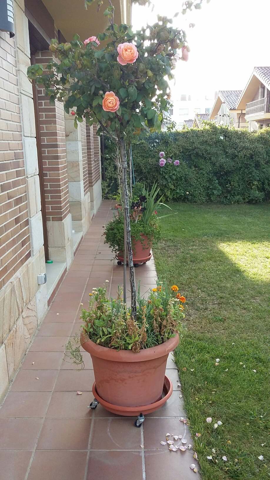 Que barbaridad de rosas tiene el Pierre de Ronstard, dan ganas de comprar lo. No se le ve sistema de riego, luego es una zona que llueve con frecuencia, y el sustrato no se ve nada viejo, seguramente, renueva cada año, y me he fijado en las macetas negras cuadradas, ideales para rosales.