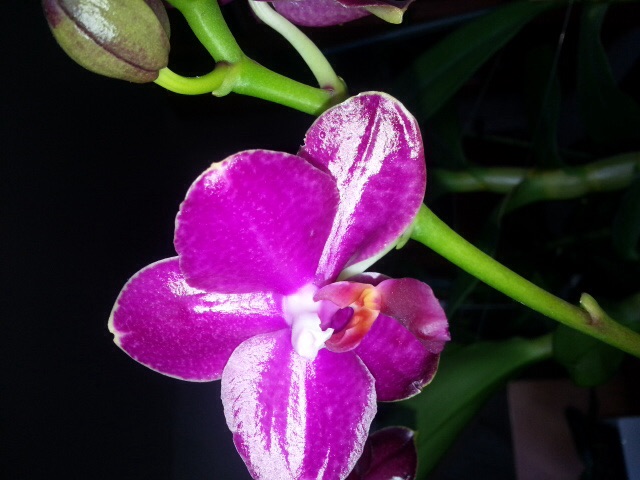 Vegetalia, gracias por lo del "brazo verde" pero que mas quisiera....aquí se está aprendiendo siempre, con los fallos y los aciertos. Jorge, preciosa la macroplectron, una sola flor basta para admirarla. Hay que ver lo contento que estamos con la vitelina. Es una campeona. Pues una sola flor os traigo, ha sido una lástima que perdiera otra un día antes de abrir, cayó sin saber el motivo. Es una preciosidad que me trajeron los reyes: Seis cm. tiene la niña, un pedazo de flor comparada con la planta.