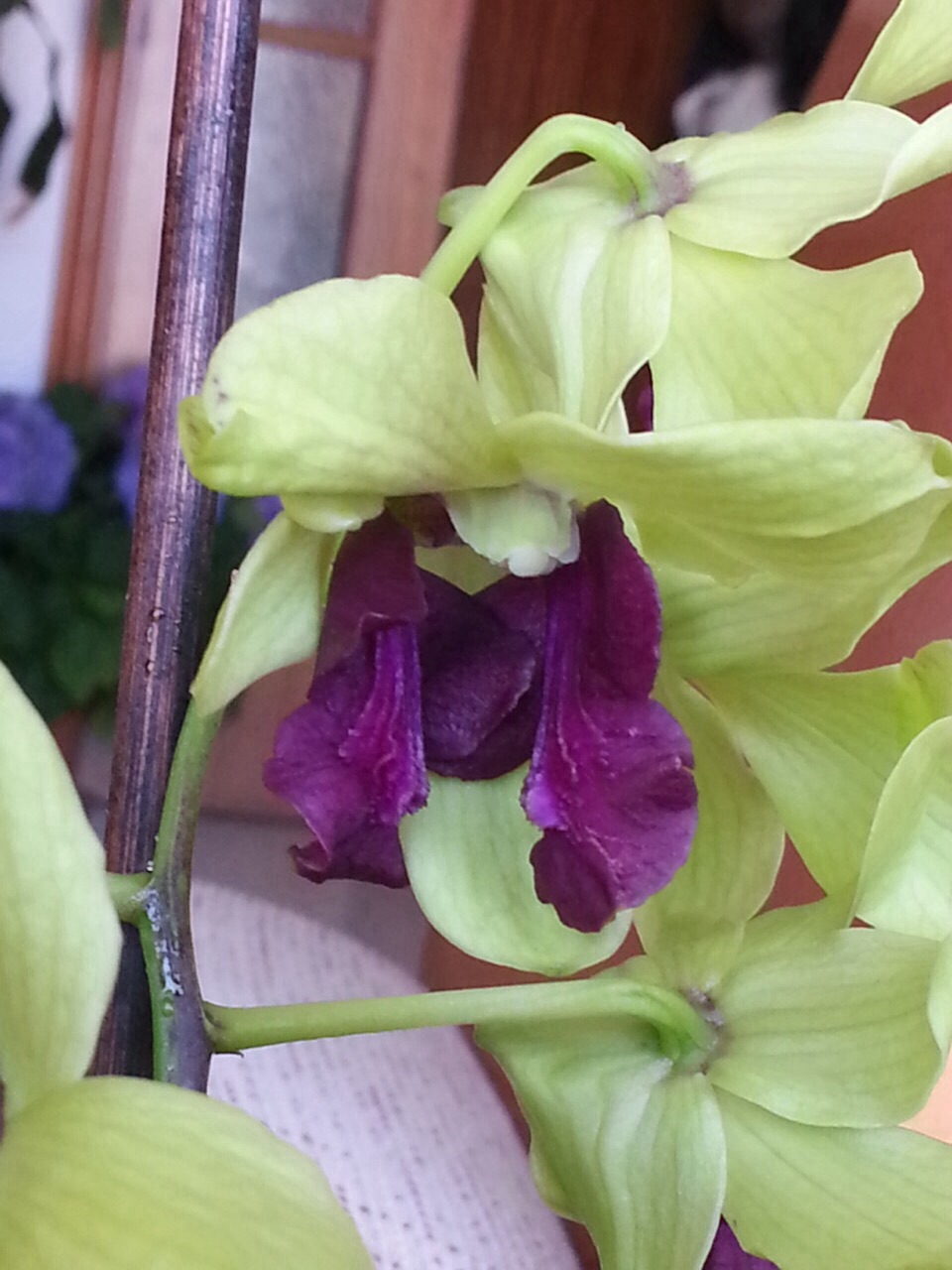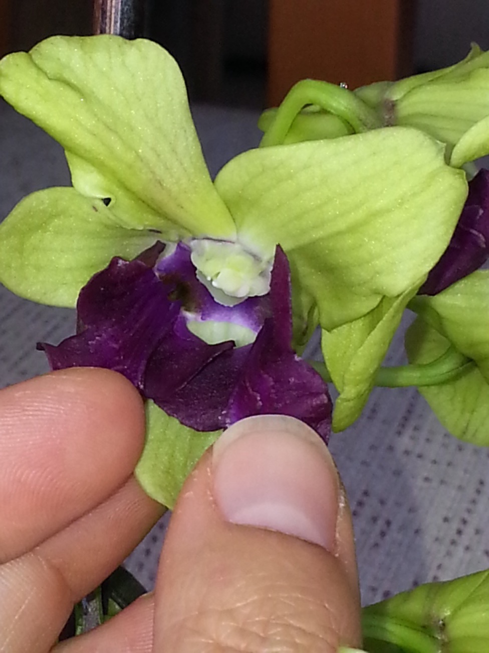 Iñigo, pero que les das a rus plantitas que florecen toas, la bellina preciosa, y el paphio ya ni te cuento....y eso que no soy mucho de paphios. Jorge, que bonito el ibaguense, yo también tengo uno, pero es peque aun y no florece, que tamaño debe tener para que le pueda ver las flores? Bueno, yo hoy os traigo un pequeña curiosidad. Se trata de mi anna Green, lleva en flir desde lad navidades, cuando seca una vara, abre otra y mínimo tiene un par de varas en flor desde esta navidad (loca de contenta me tiene), el caso es que dar tantas flores alguna tenía que salir rarita. Que no veis nada extraño? Os la pongo de más de cerca Si, son dos labelos completos... Ha perdido un petalo y ha ganado un labelo... Hasta tiene dos espolones Si todo va bien en breve tendré para compartir con vosotros algo más que deformidades...tengo en estado buena esperanza una pareja de miltoniopsis (son la misma), una nelly isler, un paphio, un hiíbrido primario de phal, una catt (la primera que logro hacer florecer) y por fin mi rhynchostilys coelestis . No me puedo quejar