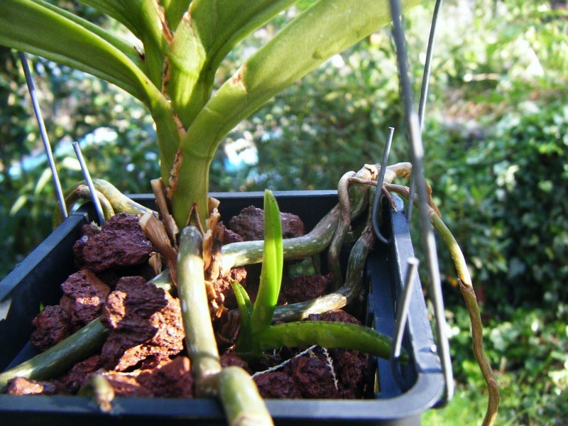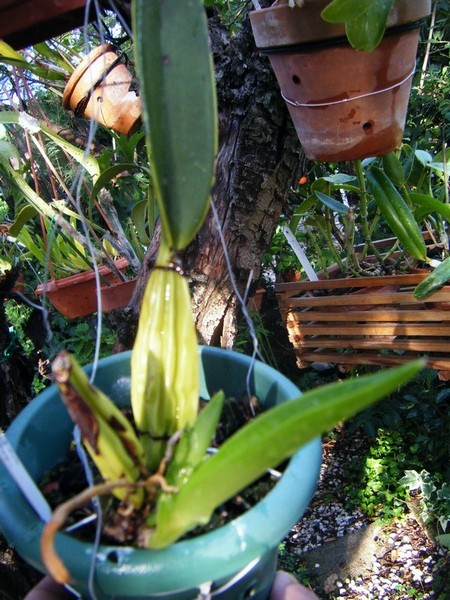 A mí la Schomburgkia (actualmente Myrmecophila) me ha sacado un brote nuevo que está bastante grandote. Es el tercer brote desde que la tengo (se la compré a Rubén en agosto el año pasado), pero el primero que me echó se pudrió, elsegundo está bien, pero este brote es mucho más grande que los otros dos que me ha echado. A ver si este año sí la veo en flor. La compré así montada en corcho y así se ha quedado. La riego como mínimo una vez al día. La tengo colgada en el membrillo que tengo en el jardín donde recibe bastante sol directo todo el día. Uno de los pseudobulbos antiguos está un poco quemado por el sol, pero el resto está muy bien.