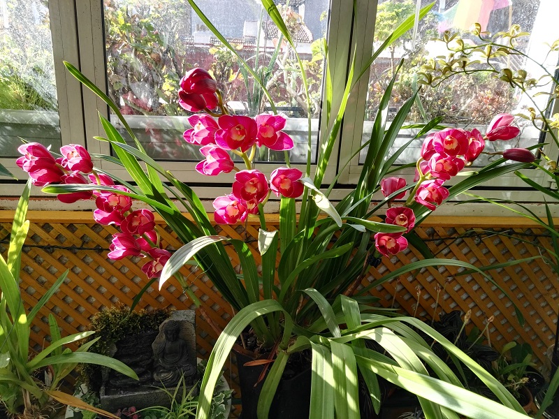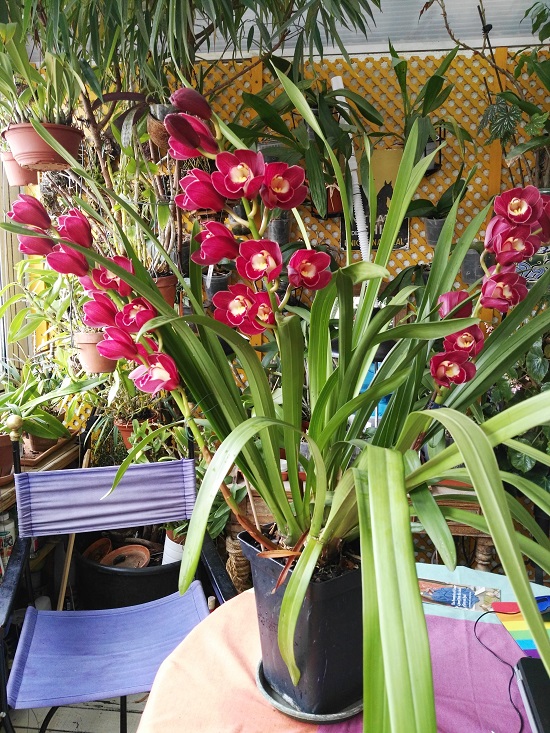 Cattleya maxima. Tan solo tiene una flor, falta poco para que reviente otra espata. Laelia anceps cihilapensis. Una NO orqui. Esta vara de cymbidium ha sacada flores con coloración diferente ¿el sol?