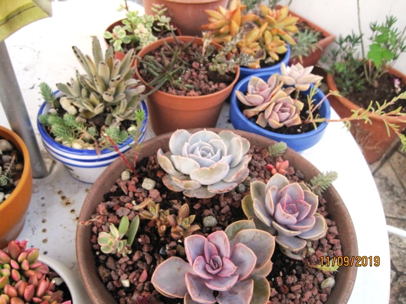 Hola a todos, Tengo estas echeverias que me han sufrido mucho por la lluvia de estos dias y ya previamente estaban un poco mal porque a las rojas les dejé las varas florales y se desvitalizaron bastante. Hace como tres años que las tengo y pasan por épocas mejores y peores. He puesto hojas a enraizar por si acaso. Estas pálidas me parecen las más delicadas: Estas rosadas y lila creo que son Perle de Nurnberg y me gustan mucho. Lo han pasado muy mal y se están reponiendo. A veces planto alguna portulaca que alegre la maceta, pero ya quedan pocas en flor: Y esta es muy oscura casi negra, con flor roja, me encanta: Sus nombres no los sé, y tampoco el de esta de hojas tan gorditas y algo rayadas, que crece muy muy despacio y me llama la atención: - Esta creo que es portulacaria afra y la compré muy pequeñita. Me parece preciosa: He recibido esquejes de euphorbia tirucalli y otras cosillas pequeñitas y ya me están enraizando las hojas de kalanchoe orgyalis, que me hace ilusión. Bueno, que soy una ignorante que hasta hace dos semanas creia que el sedum palmieri era una siempreviva Buenas noches a todos.