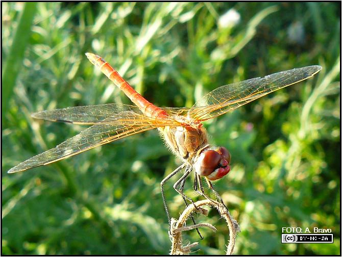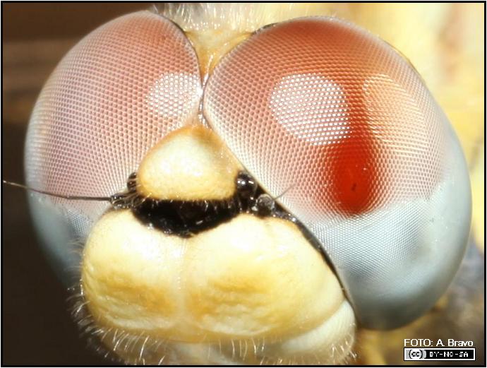 FAUNA AUXILIAR Regulación Biológica: Aliados para una Agricultura y Ganadería Sostenible. FAMILIA LIBELLULOIDEA DESCRIPCIÓN: Acabado el verano, hablaremos en esta nueva entrada de un insecto depredador muy antiguo..., que a buen seguro encontraréis familiar y que habréis podido contemplar durante el pasado periodo estival. Nos referimos a las libélulas, que engloban a una serie de especies de insectos con unas características comunes muy primitivas. Sympetrum sp, sobre flor de brócoli morado. Si incluimos también a los llamados caballitos del diablo, podemos afirmar que esta Orden representa aproximadamente unos 6.000 individuos diferentes entre especies y subespecies en todo el mundo, de las cuales, sólo 65 de ellas se encuentran descritas en Andalucía. Estos insectos que dan nombre a toda una Orden Odonata, cuya denominación proviene de la contracción de las palabras griegas “odonto” (diente) y “apathos” (mandíbulas) algo así como “mandíbula dentada”, fueron en el pasado mucho más grandes que las libélulas actuales. Detalle de los ojos compuestos de estos insectos, donde se les contabilizan unos 40.000 omatidios. Tened presente, que se han descubiertos fósiles de megalibélulas (meganisopteros) en estratos datados en el periodo Carbonífero hace unos 320 millones de años (en Commenty L’Allier, Francia), que dan constancia de una envergadura alar extraordinaria de estos insectos, como así atestiguan las especies encontradas Meganeura monyi y Meganeuropsis persiana con 69-72 cm de longitud. Este tamaño equivaldría al actual de un cernícalo común, la verdad... es que si hacemos un pequeño esfuerzo de imaginación, nos ocasionaría cuanto menos un poco de inquietud, el encontrarnos actualmente con alguna libélula de ese porte revoloteando por la piscina que frecuentamos este pasado verano. Las hojas de cebolla, le proporciona un oteadero privilegiado sobre el resto del huerto. ESPECIE CONTROLADA: Lejos de temer a estos paleópteros, debemos considerarlos como unos extraordinarios aliados de nuestro agroecosistema, puesto realizan una labor depredatoria muy importante, tanto en su fase acuática o larvaria donde eliminan muchas larvas de mosquitos, como en su fase aérea en estado adulto, depredando de forma generalista cualquier insecto con un tamaño inferior a ellos que cazan al acecho o en pleno vuelo. Muchos de sus víctimas se comportarían como potenciales plagas de nuestros cultivos de no estar presentes. Aunque es difícil establecer con precisión una lista de insectos depredados, hay que destacar que incluyen esencialmente los insectos que frecuentas las zonas húmedas: dípteros, tricópteros, efémeras, etc, en definitiva, presas proporcionales a su talla y piezas bucales. Detalle de la extraordinaria musculatura del tórax que le permite despegar en vertical. Su gran visión le hace una cazadora casi infalible, controlando un perímetro visual cercano a los 360º como podemos presuponer por la posición de sus ojos compuestos, que ocupan prácticamente toda la cabeza. Exuvia de la larva de libélula tras la metamorfosis. BIOLOGÍA: Este carácter primitivo de los odonatos, le hacen pertenecer a un grupo de insectos con una metamorfosis incompleta denominada hemimetábolos, es decir, que el ciclo vital del insecto está desprovisto de un estadio ninfal inmóvil, lo contrario que ocurre con insectos como las mariposas, con una metamorfosis completa (homometabolos), donde sus larvas crisalidan inmóviles mientras se transforman. La puesta sigue más o menos rápidamente a la cópula y que dependiendo de la especie, el macho se separará justo después de la inseminación (como en el caso de la Crocothamis erythraea), o en otros casos la pareja adopta de nuevo la posición en tándem y, tras un período más o menos largo, van en busca de un lugar de puesta. El lugar elegido para la puesta, variará de la especie, pero generalmente se realizan en vegetales vivos con órganos sumergidos o incluso aéreos (cercanos al agua), o en partes vegetales flotantes, musgo e incluso en superficies fangosas o directamente en el agua. Detalle de la oquedad del tórax provocada por la salida del imago. Como sabéis, la fase larvaria de las libélulas se desarrolla totalmente en el medio acuático, donde su larva tras la eclosión, se vale para alimentarse de una estructura específica para capturar las presas denominada máscara o "labium". Estas larvas llegarán a cazar desde insectos acuáticos hasta pequeños peces, cambiando de aspecto, e incluso de medio, -fase aérea- hasta llegar al estado adulto. Sin embargo, este paso de la vida acuática a la aérea no tiene lugar de forma brusca, sino que se realiza paulatinamente. Puesto que algunos días (a veces semanas) antes de la metamorfosis, la larva empieza a salir del agua por períodos cada vez más largos respirando progresivamente por los estigmas torácicos, hasta abandonar definitivamente el líquido elemento tras subirse en un tallo elevado, como podemos apreciar en la foto anterior. Orthetrum sp. Sympetrum sp. MEDIDAS PARA FAVORECER SU PERMANENCIA EN NUESTRO AGROECOSISTEMA: De amplia distribución, los odonatos son un grupo de insectos ligado al medio acuático, pues sus larvas tal como decíamos se desarrollan en el agua, ya sea en ríos, arroyos, en lagunas y/o pequeñas charcas. La mayoría de las especies de libélulas, presentan una gran especificidad respecto a su hábitat, por lo que pueden ser consideradas como buenos bioindicadores de la calidad del agua donde encontramos sus larvas. Esperan pacientemente en oteaderos hasta visualizar a una presa potencial. Por tanto, no es descabellado dejar algún punto de agua permanente en nuestro agroecosistema, de manera que podamos fomentar la presencia de estos insectos. Igualmente, como hemos indicado en alguna otra ocasión, el dejar unos "palitos" elevados entre nuestro huerto a modo de oteaderos, facilitarán la caza de nuestras libélulas
