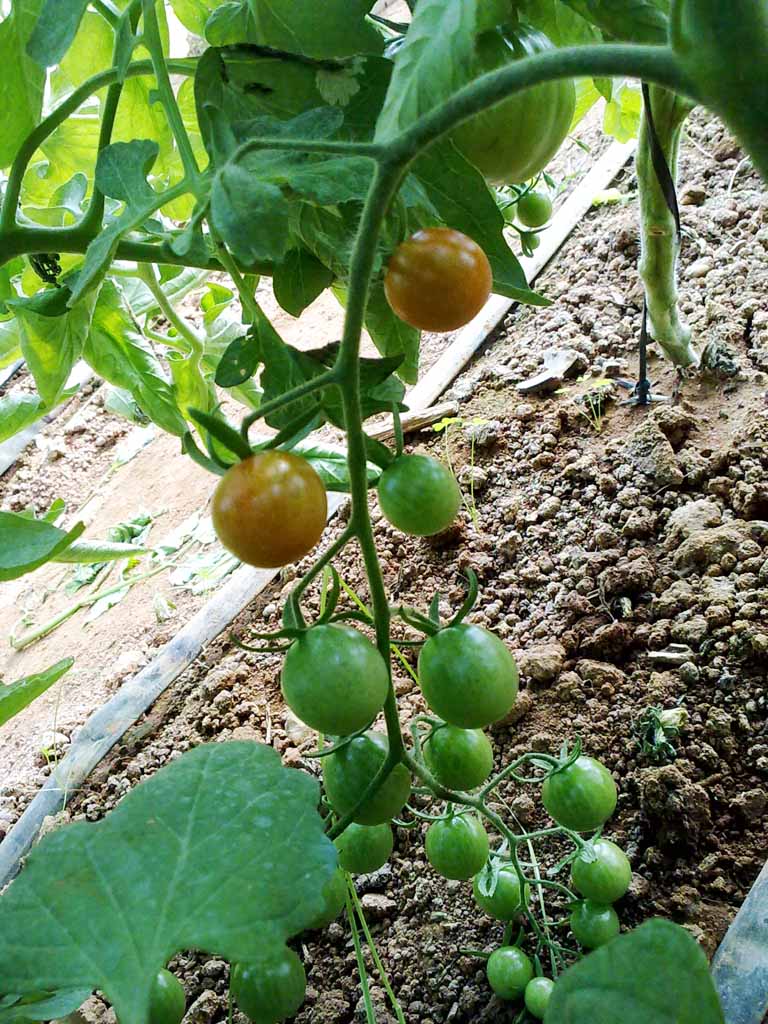 Re: TOMATES en invierno, (3ª temporada) por ta- hola a tod@s bueno, una grata sorpresa me he llevado hoy, miren los primeros tomatillos (cherrys negros) que estan madurando no me lo esperaba tan pronto, mas que nada porque estan todabia algo chico, pero bueno esto no va tan bien, las hojas centrales se estan como quemando por los filos y me tiene algo preocupado, ¿alguien tiene alguna idea? ni las lechugas que estan subiendose, no se si sera por la temperatura del invernadero