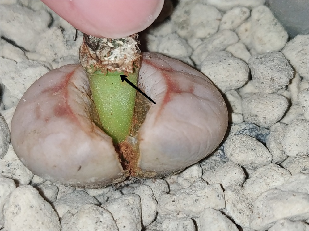 He dudado en si operar o no, pero después de valorar y ver que de esos ejemplares tengo varios parecidos me he arriegado, reconozco que soy súper curiosa y no he podido evitarlo...si sale mal no es una gran perdida, pero me quedo sabiendo lo que era eso...de hecho lo he cortado por la mitad, y parece como si fuera una hoja fe lithops, tal cual, lo que me ha llamado la atención es que partía de la parte alta del tallo de la flor, no de la base, se ha quedado como si no hubiera tenido nada ahí colgando...eso sí, el interior de la fisura se ha quedado hueco, pienso que he hecho bien, porque aquí las hojas nuevas se desarrollarán sin problemas y si nada que les quite el espacio...he sellado todo con canela, últimamente la uso casi todos los días, porque siempre me encuentro alguna raja nueva... Ha quedado asi, toda esa "masa" estaba unida al tallo de la flor por esa delgada línea que se he señalado con la flecha...cuando lo compré vi la capsula rara pero no me imaginba eso, estaba rajandose porque intentaba sacarlo de dentro...