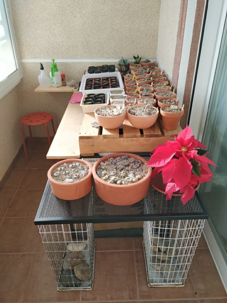 Uppss @tecnopica se me había pasado tu mensaje!! Ojalaaaa!!! jajajajaja Reconzco que siempre me ha encantado observar la luna y las estrellas, de hecho mi hija se llama Estrella, pero solo es una coincidencia... que sería el mundo sin la risa??? Hay que tener buen humor, que las cosas malas vienen solas Mi trabajo digamos que es más "terrenal " ...en una clinica de endoscopia y proctología, de ahí que peque de poco escrupulosa y no me de miedo usar las pinzas Y como caído del cielo, sin yo esperarlo, me he traído del trabajo, que la iban a tirar, una bandeja metalica muy apañada, que junto a unas papeleras metálicas (también de mi curro y que también iban a la basura) me han apañado una mesa muy recurrida, no era el plan que yo tenía para ampliar la mesa, pero por el coste que ha tenido k(0 euros) y el trabajo que me ha llevado ( nada) me ha solucionado de momento el apuro Os quiero presentar un L. pseudotruncatella pero que parece que este preñado, termino la muda en octubre y ahora se aprecia que irá a mudar otra vez...cosas que dicen que le pasan a los lithops recién adquiridos...tiene una barriga refondita!! El pleiospilos Royal Flush que tuve que operar de urgencia por necrosis y podredumbre se recupera favorablemente y ha cogido colorcito por el sol Y el último paciente intervenido también se recupera favorablemente, está estable y sin cambios Y hasta aquí el informe de hoy
